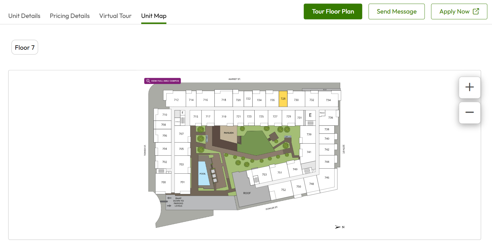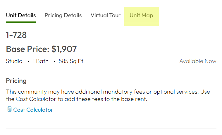 The unit map appears in the details section for available unit(s) beneath Pricing & Floor Plans.
