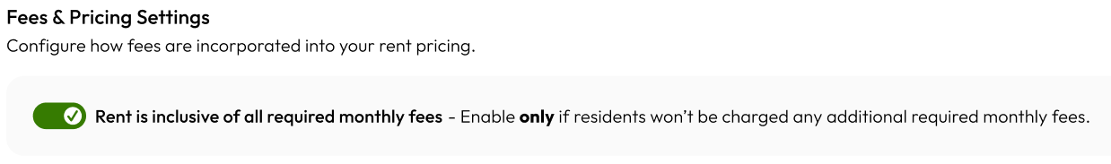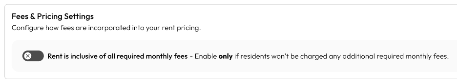 - Locate the Fee & Pricing Settings section at the top of the Fees & Policies page and enable the Rent is inclusive of all required monthly fees toggle.