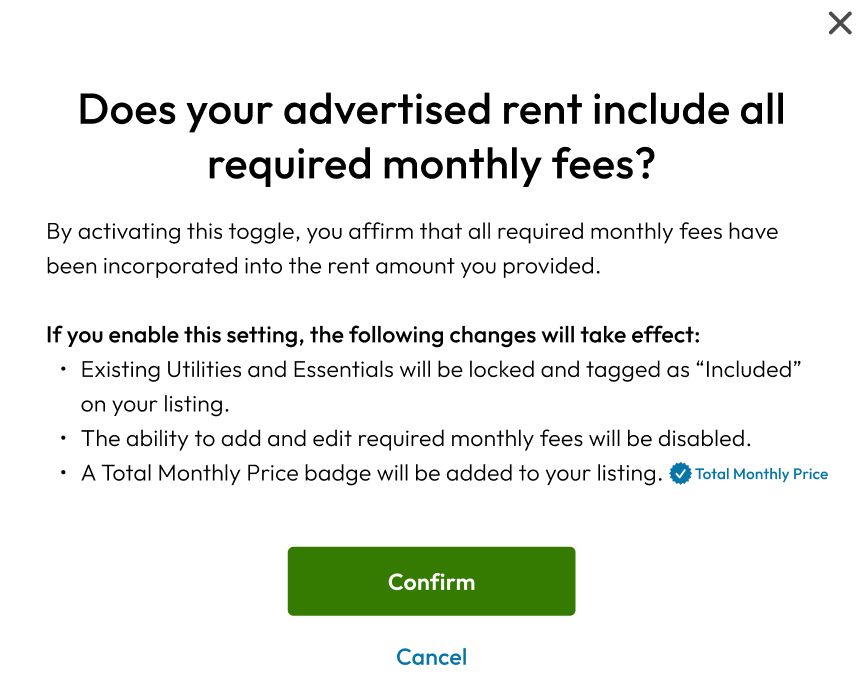 Important: Enable this toggle only if all of your monthly required fees have been incorporated into the rent amount you provided.