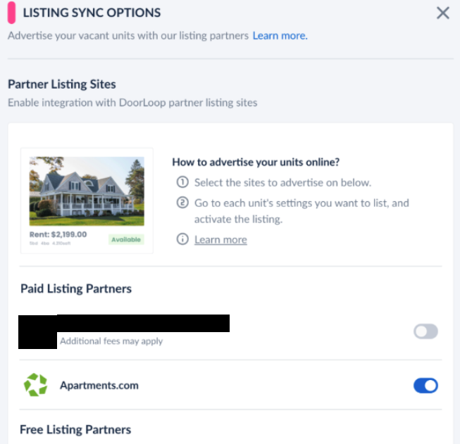 Connecting your listing refers to the process of syndication. Syndication is another way of describing the communication of listing information between a third-party service and Apartments.com. The following steps provide instructions for enabling property syndication using DoorLoop.